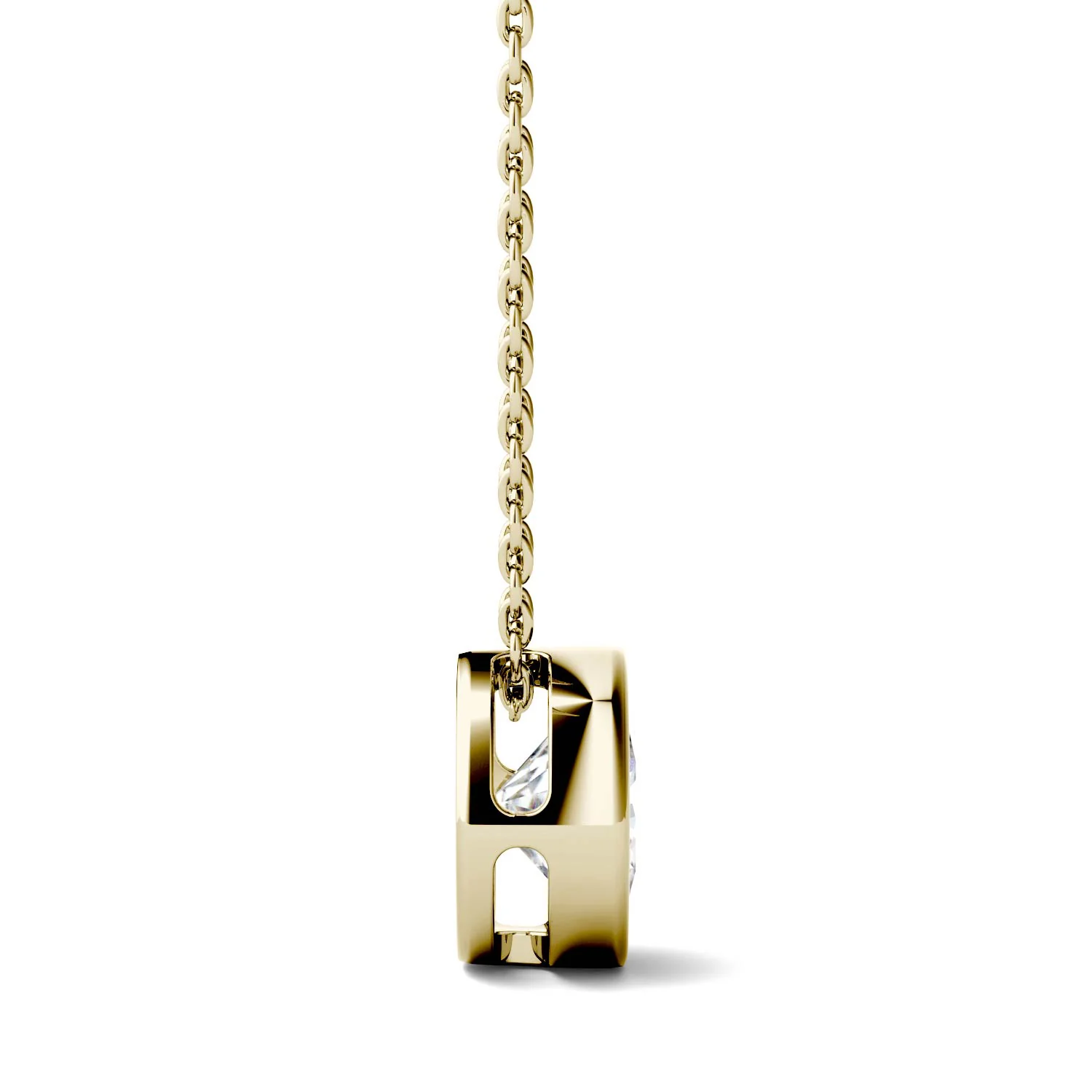This 14k yellow gold bezel pendant necklace features a sparkling 1 carat tw Moissanite by Charles & Colvard. Its 18" box chain is crafted in coordinating gold and features a lobster claw closure.