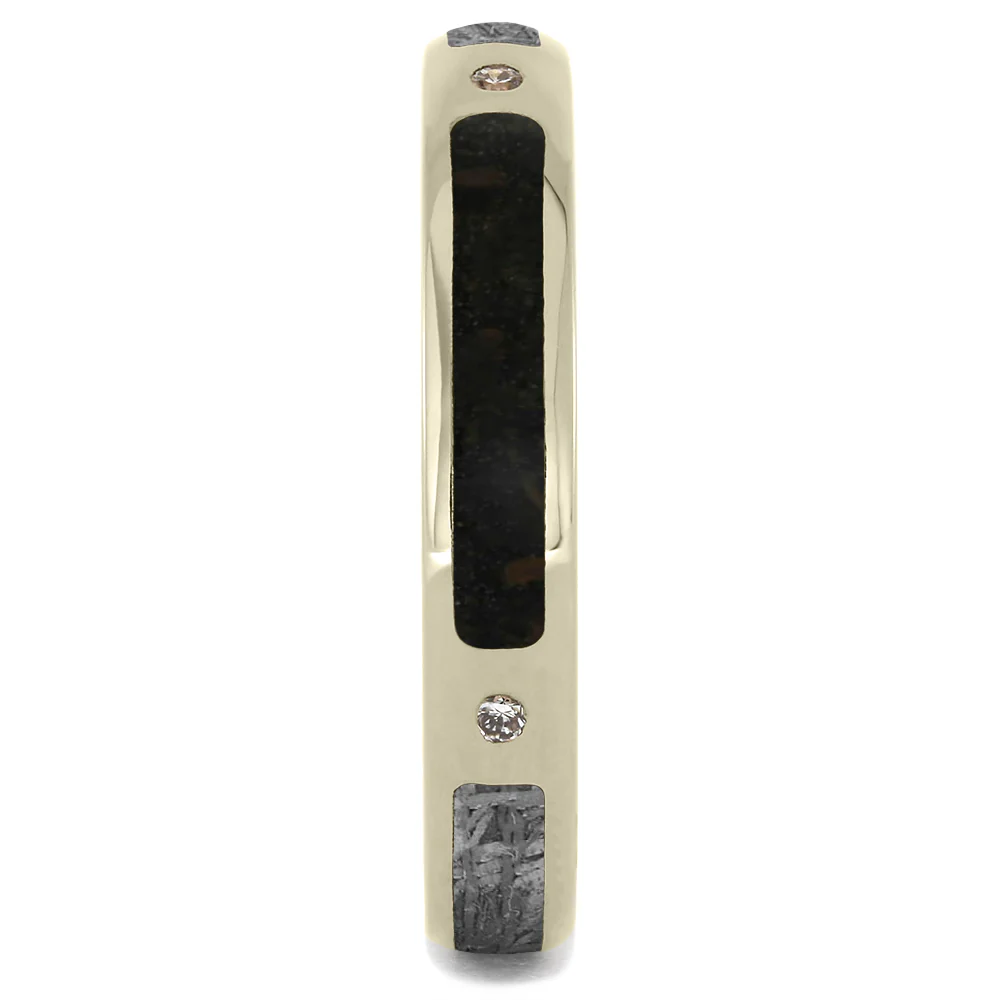 Here is a masterful, dainty diamond ring for women with some magnificent materials. A small strip of dinosaur bone sits between the two dazzling diamonds. Along with the Jurassic beauty is amazing Gibeon Meteorite. The meteorite’s Widmanstätten pattern is appreciated for its beauty both by collectors and designers of jewelry.