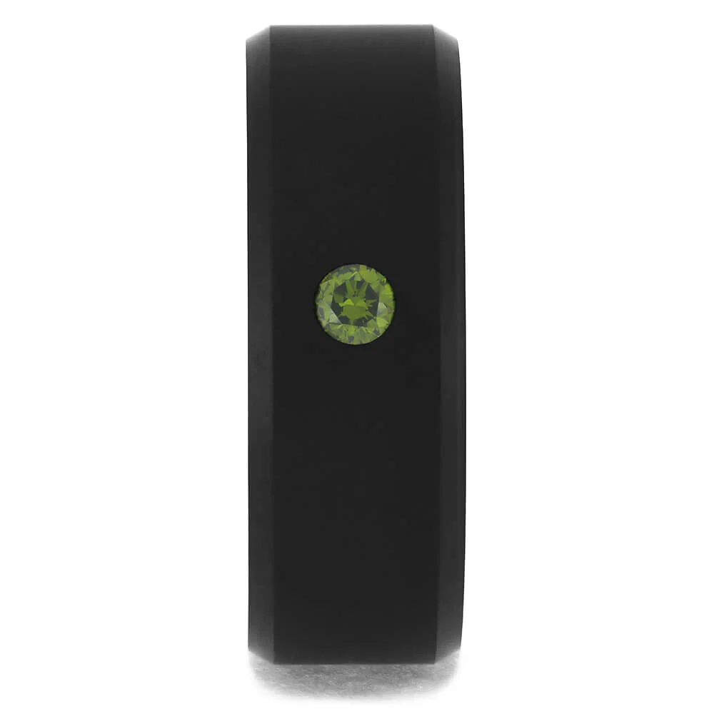 This ring features a solid diamond band with a round-cut green diamond center stone. Elysium Designs has given Jewelry by Johan the honor of selling their Elysium ring line! These black rings are made of pure lab-grown diamond crystals - all compressed together under 1 million PSI and 2700° F. These lightweight premium rings are 16-18 carats total. They never change color, scratch, or fade. In an emergency a ring cracker is capable of breaking the diamond band.