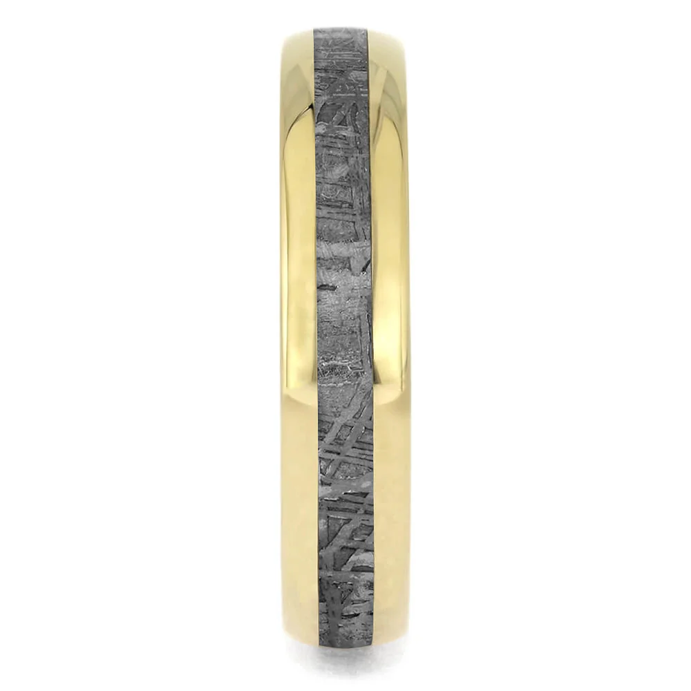 Fashioned in a solid yellow gold this simple and stunning wedding band boasts a spectacular pattern. The Gibeon meteorite has been etched with an acid to reveal the Widmanstätten figures.