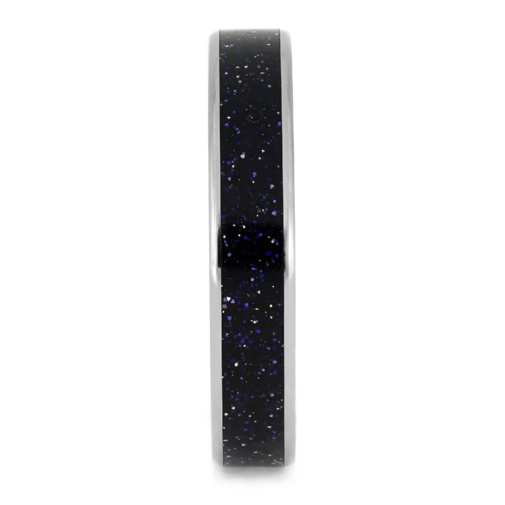 Shimmering fractals glisten between titanium borders in this elegant blue goldstone ring. The deep blue hue of the glistening goldstone inlay resembles a starry night sky and provides a mesmerizing accent to any attire.