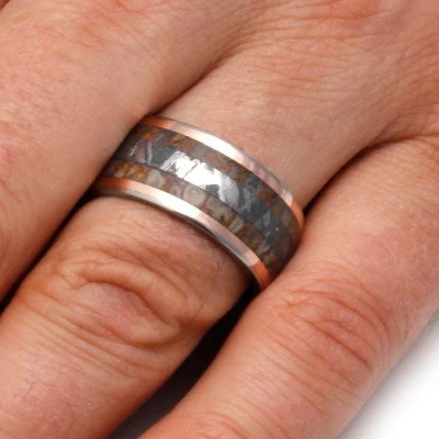 This dinosaur bone ring is decorated with distinct, exotic materials. Dark fossil inlays border a center stripe of metallic Gibeon meteorite. There are also two bands of 14k rose gold for an added splash of shine and color. This dinosaur bone wedding band is perfect for geologists, biologists, and astronomy enthusiasts!