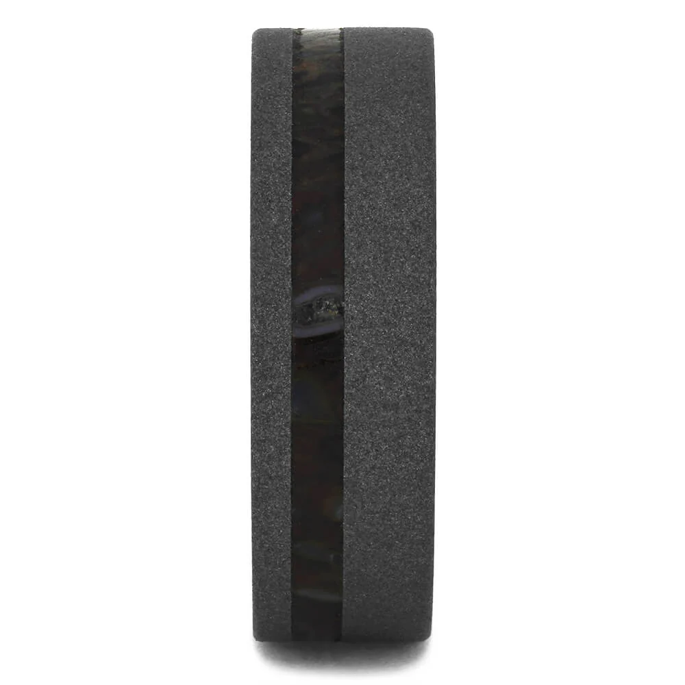 Bring back the Jurassic Age with this dinosaur bone wedding band. The sandblasted titanium ring has a rough texture and look, perfect for your rugged lifestyle. Sure to draw attention with its natural, one-of-a-kind pattern this fossil ring is a great gift for someone special in your life.