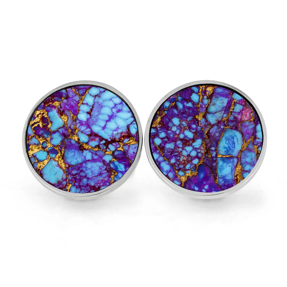 These round cuff links crafted in polished sterling silver can be customized to feature any of our colorful gem alloy materials. Each showcases a unique combination of blue, purple and green colors for a one-of-a-kind suit accessory. They pair perfectly with other items in our gem alloy jewelry collection to create a complete, men's accessory ensemble.