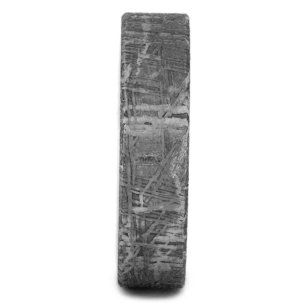 This Gibeon meteorite ring is made with a smooth tungsten carbide sleeve. The crystalline grain structure of the meteorite is unique and called Widmanstätten pattern that were caused by the meteorite slowly cooling over millions of years as it hurtled through space.
