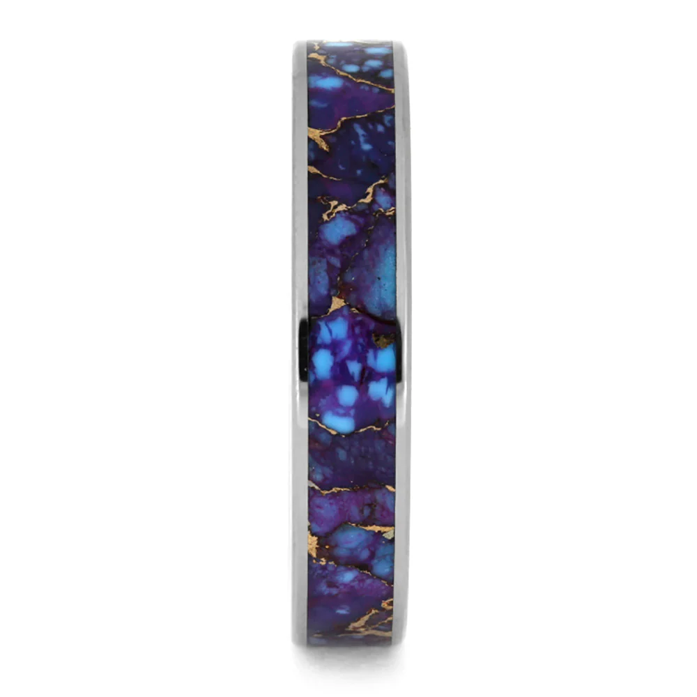 Add a brilliant, memorable accent to your style with this lava mosaic turquoise ring! Turquoise blended with violet pigments and bright metal strands give this titanium ring an organic, futuristic look.