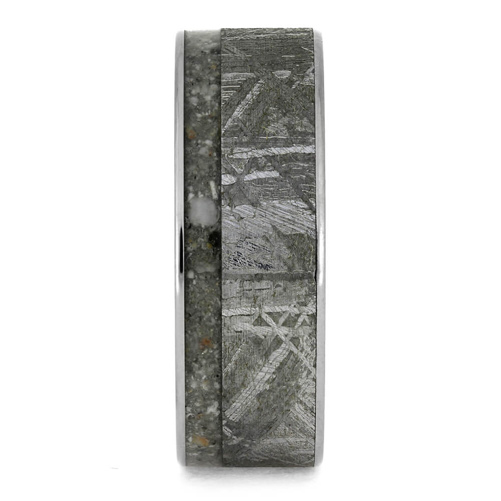 Keep your pet’s memory close at hand with this symbolic meteorite memorial ring. Real meteorite and polished titanium accent the ash inlay, which is sealed in a protective coating. For added visual interest, oak wood from a real whiskey aging barrel lines the sleeve of this handmade ring. All of these unique and symbolic materials are protected with durable titanium borders on each side of the ring. This cremation jewelry is a thoughtful gift for anyone mourning the loss of a family pet.