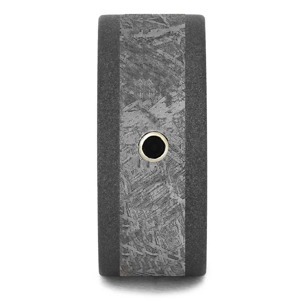 Gibeon meteorite and black diamonds are a seemingly perfect match. Both extraordinarily unique elements to set your men's wedding band a part from the rest. The round black diamond sits in a sterling silver bezel. This black diamond ring with sandblasted titanium interior provides a masculine shade of ruggedness.
