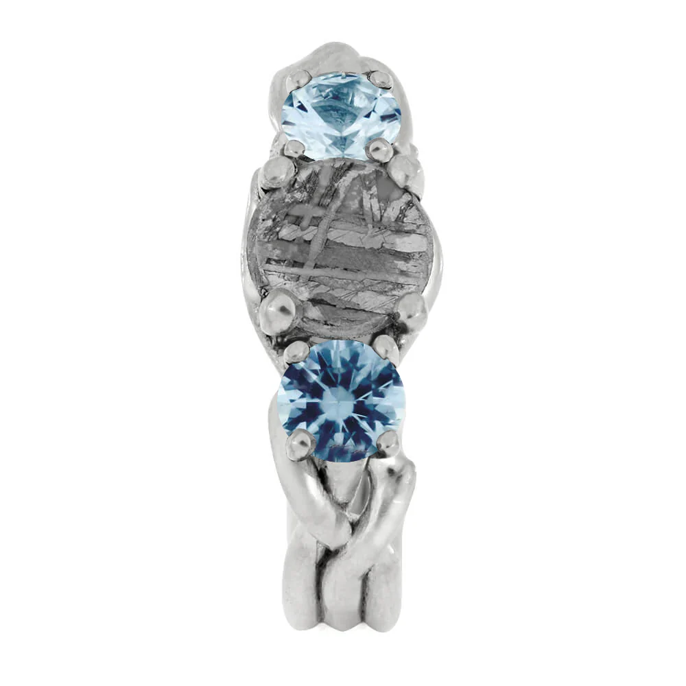 Wear one of the most unique rings there could ever be. This meteorite engagement ring is marvelous and comes in a three stone setting. The center stone is a meteorite stone with round cut aquamarines on each side. This sterling silver ring is designed with a three strand branch-like band that is twisted on the top and comes together towards the end.