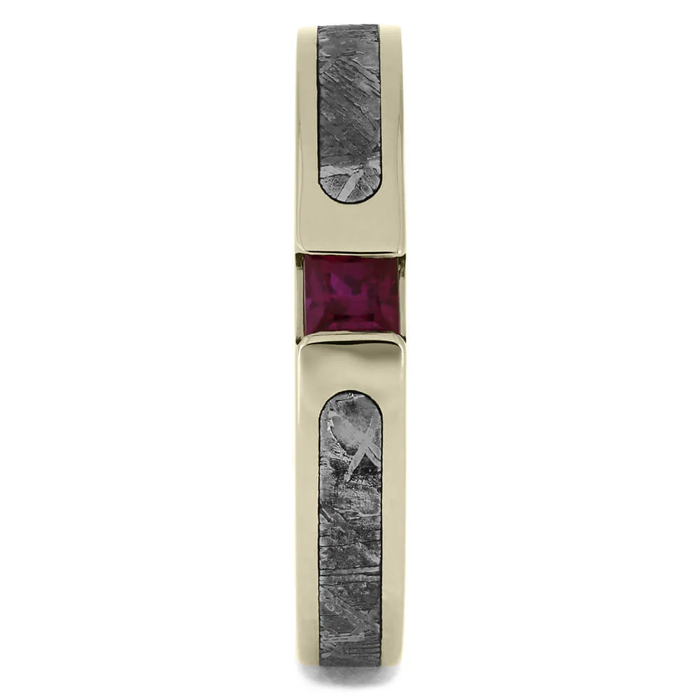 Celebrate your special love with this special meteorite engagement ring. This white gold ring is flush set with a terrific red ruby center stone. Partial meteorite inlays flank the sides of the flush set gem. Being over four billion years old this meteorite has truly stood the test of time, as with your enduring relationship. Here is a spectacular engagement ring with beauty to spare.