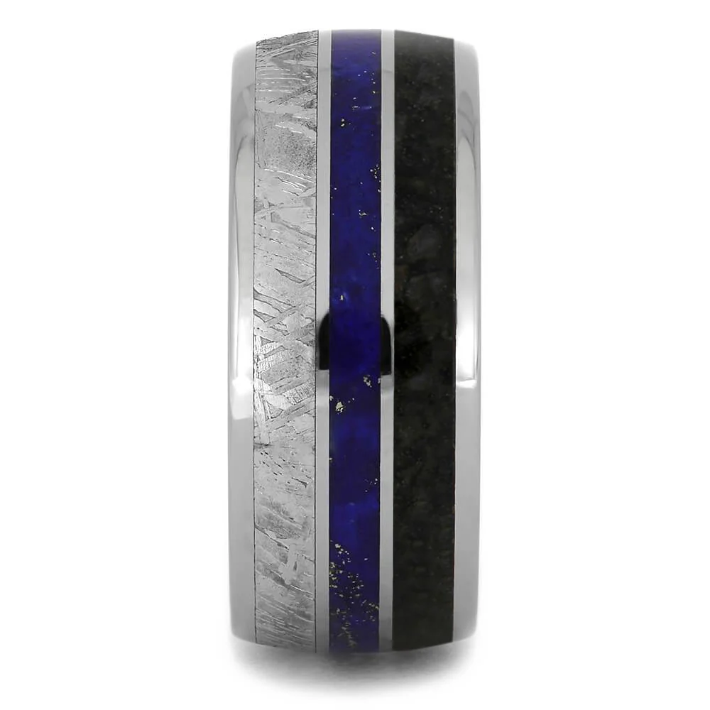 Meteorite Ring With Dinosaur Bone And Lapis Lazuli In Titanium