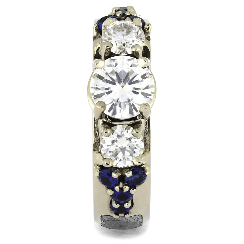 Symbolic of your past, present, and future, this Moissanite engagement ring features a captivating white gold and meteorite band. There is no other stone that shines as brilliantly as moissanite does. This engagement ring features vivid detailing in the band and stunning sapphire accents. A blue and red mokume composite sleeve adds the finishing touch to this masterpiece that she will not be able to say no to.