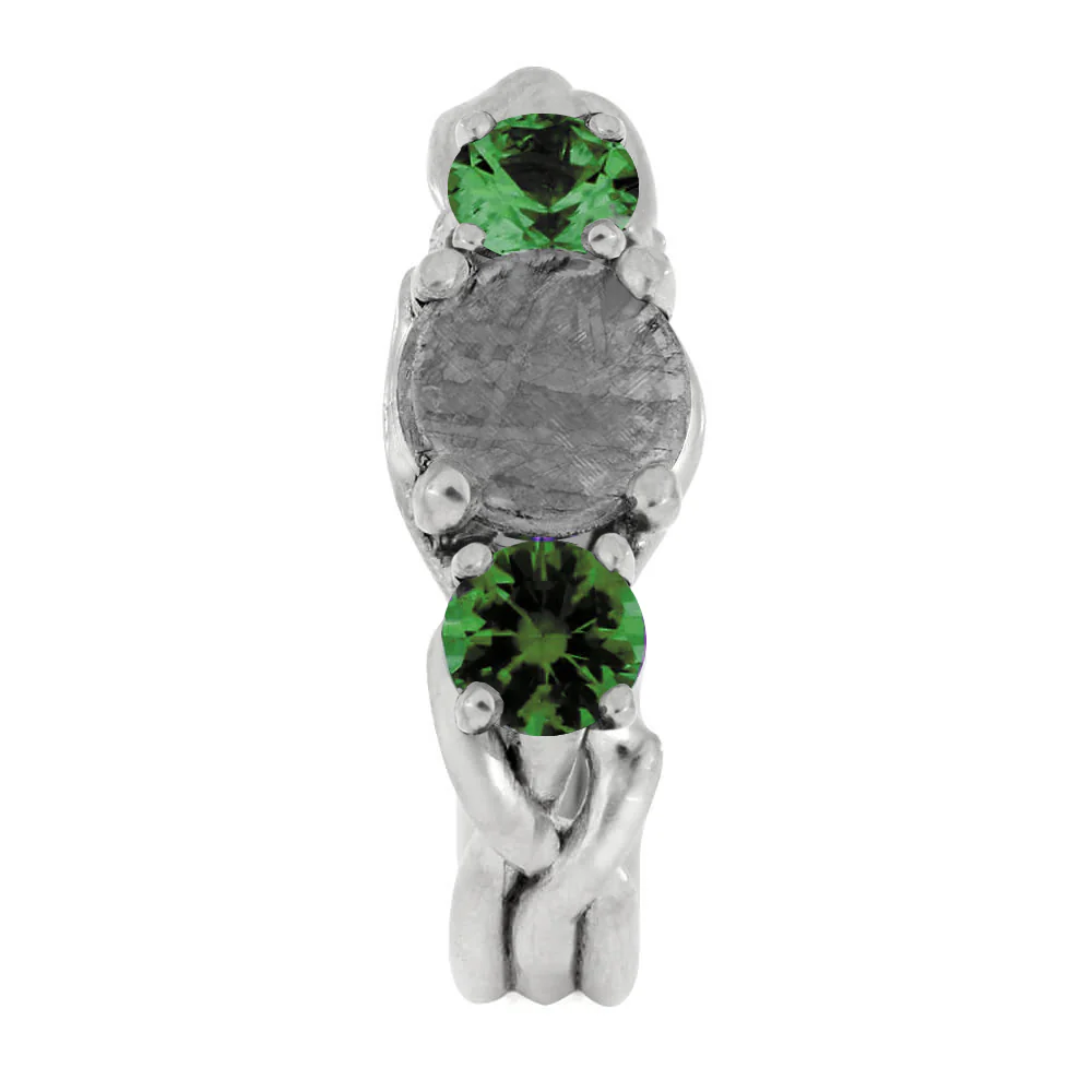 A genuine meteorite stone is the center of attention on this handmade emerald engagement ring. Crafted in sterling silver, the elegant branch design twists around each stone for a secure and stylish setting.
