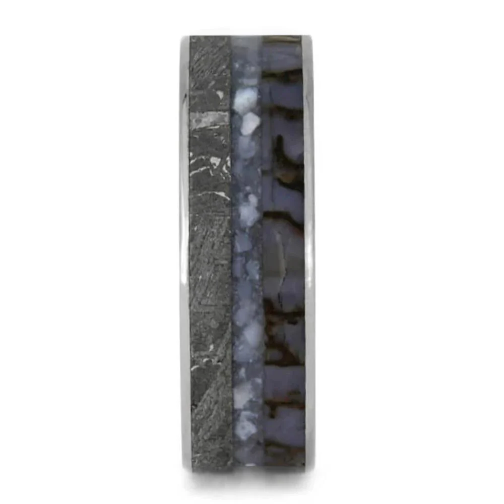 Exotic and colorful materials come together for a unique, nature-inspired style on this pearl wedding band! Gibeon meteorite and dinosaur bone are separated by a sparkling strip of crushed mother of pearl. Polished titanium surrounds the inlay for a durable and beautiful addition. This lustrous meteorite ring is perfect for geologists and astronomy enthusiasts!