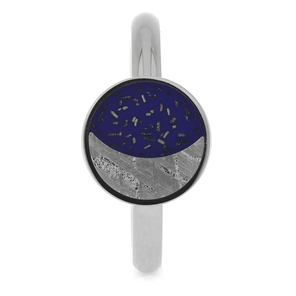 Proclaim your love for the “Moon of Your Life” or “Your Sun and Stars” with this starry night ring celebrating the bond between the stellar bodies of the night sky. The moon is displayed with Gibeon meteorite while dark blue Stardust™ creates a bright starry night sky.