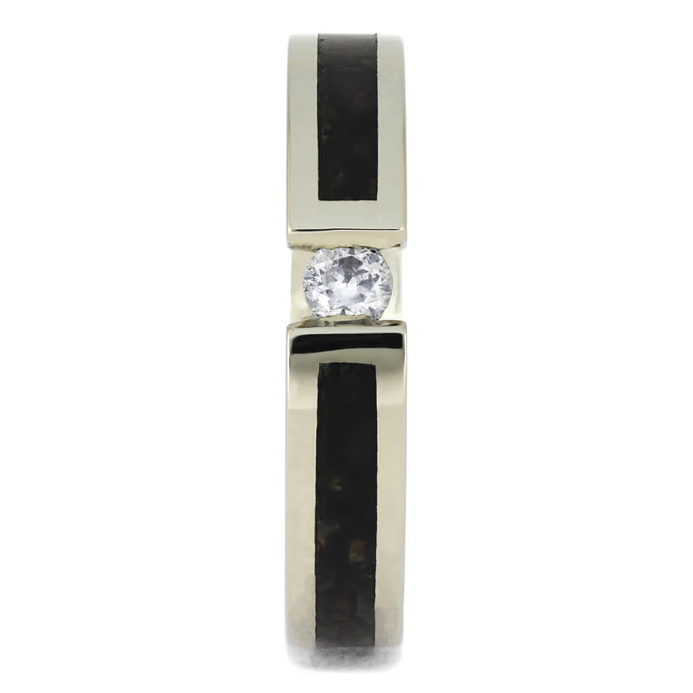 Behold the luster of this stunning 14k white gold, tension diamond ring. The clean cut diamond is wonderfully contrasted by the ruggedness of crushed genuine dinosaur bone!
