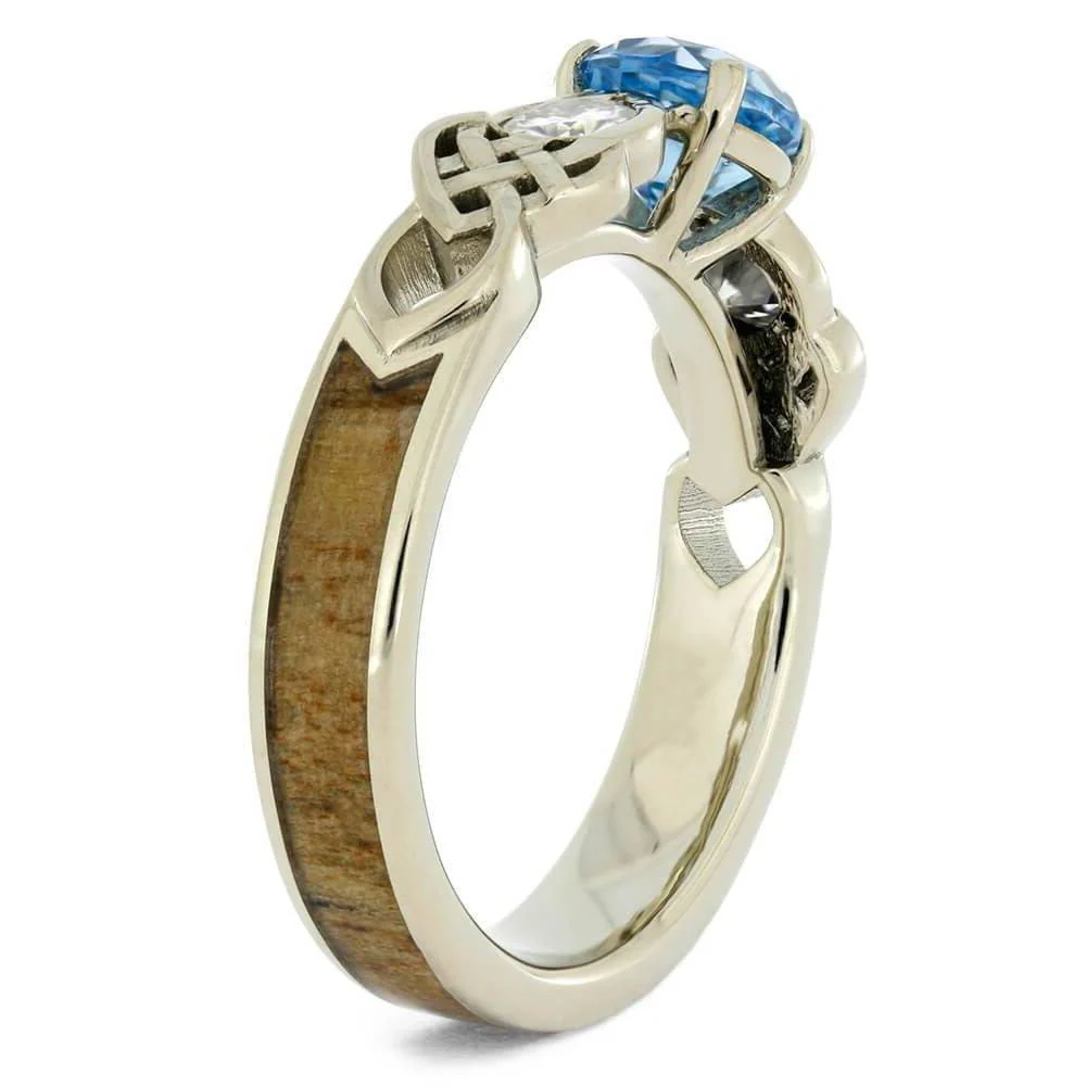 This gorgeous three stone engagement ring showcases a brilliant blue topaz and also features a Celtic design that contains two moissanite accent stones. Its maple wood inlay is nestled in beautifully polished 14k white gold.