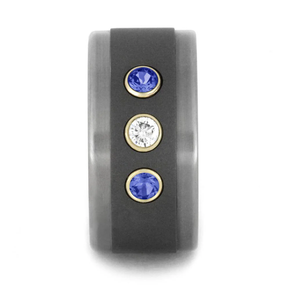 Titanium Ring with Diamond and Blue Sapphires Set in Yellow Gold