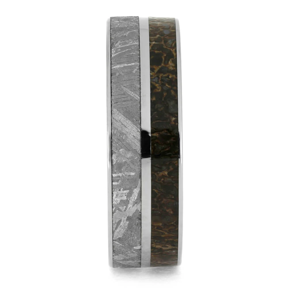 An incredible combination of rare materials make this titanium ring a genuine statement piece. The titanium ring is inlaid with gorgeous Gibeon Meteorite and authentic dinosaur bone. A sleek titanium pinstripe separates the meteorite and dinosaur bone. Each element has its own wonderfully unique pattern that is sure to have heads turning.