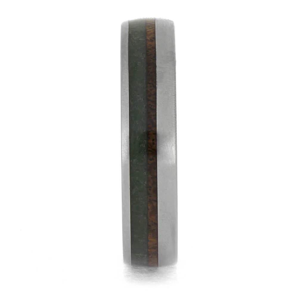 This titanium wedding band combines elements from the sea and the earth. A natural combination of crushed green sea glass and mesquite wood give this unique ring a distinct look, separating it from the pack of traditional wedding bands out there.