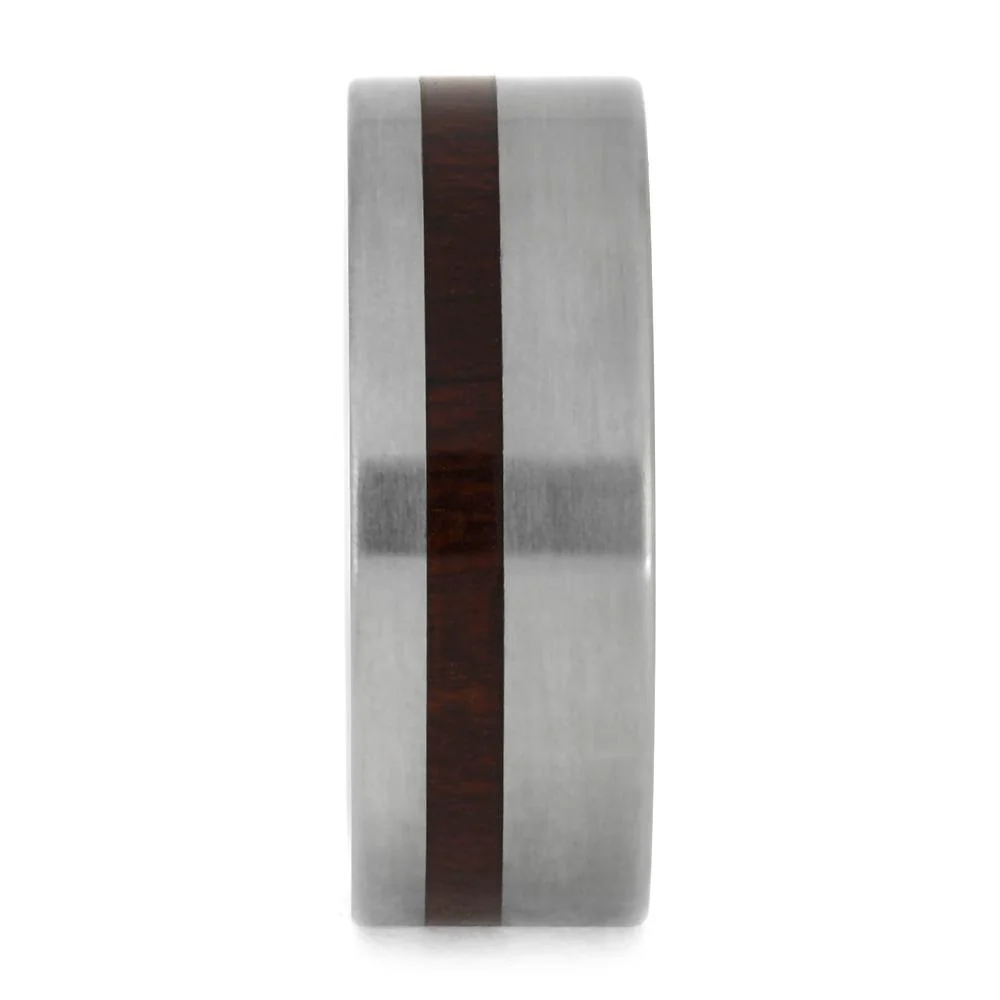 This masculine, matte titanium men's wedding band is handcrafted with a gorgeous, off-set inlay of bloodwood. The wood will be coated with our Ring Armor protection making it extremely durable and water-resistant.