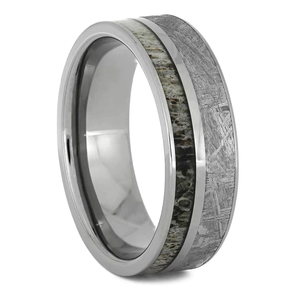 This unique wedding ring set shows off the lovely pattern of genuine Gibeon meteorite. The wedding band pairs meteorite with naturally shed deer antler while the aquamarine engagement ring sets the meteorite in a wavy 10k white gold band.