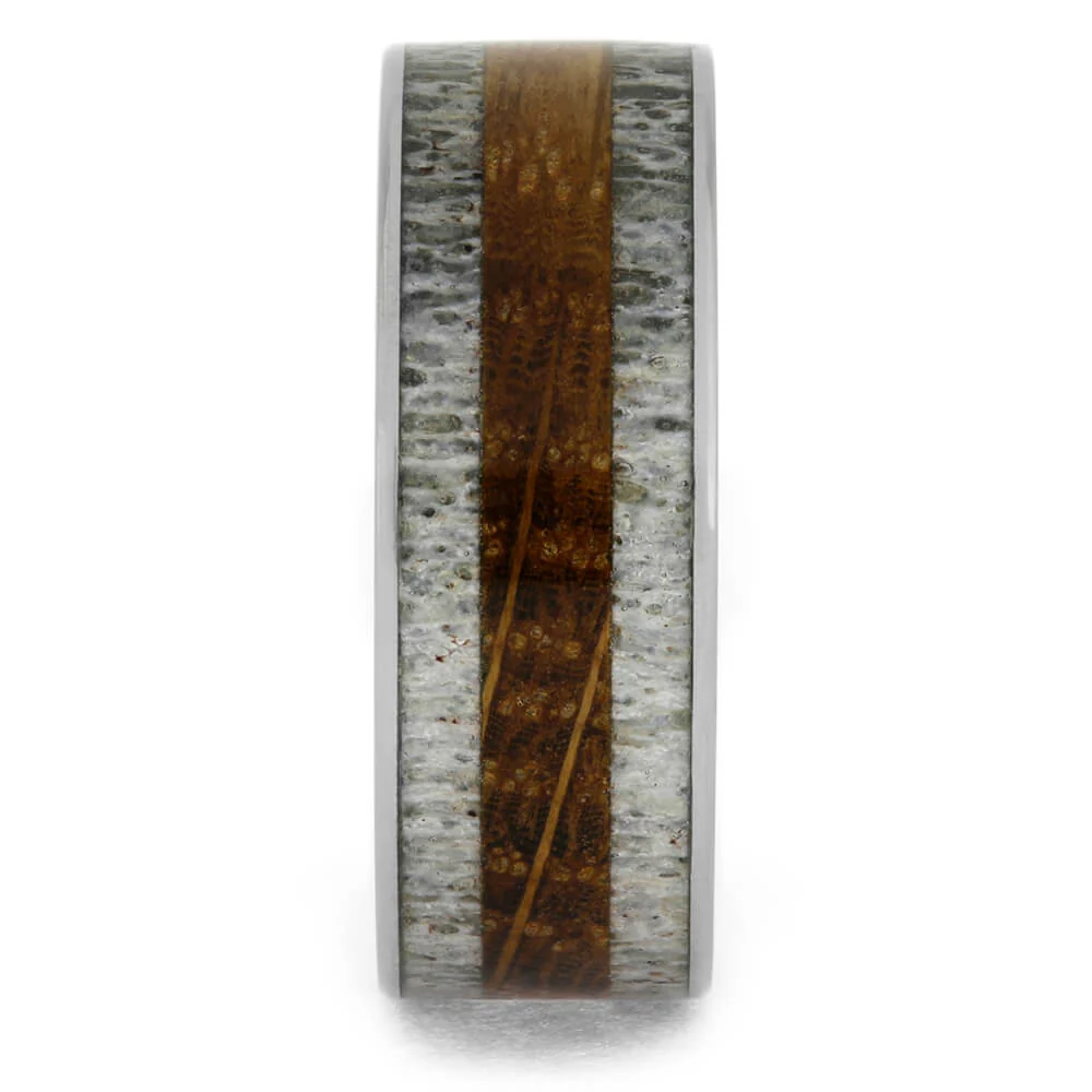 One of my popular styles has arrived with a wood that is unbelievable. This titanium and deer antler ring is equipped with a wood ring fashioned from a genuine whiskey barrel. Great as a men's wedding band for guys who enjoy a glass of whiskey as well as the great outdoors.