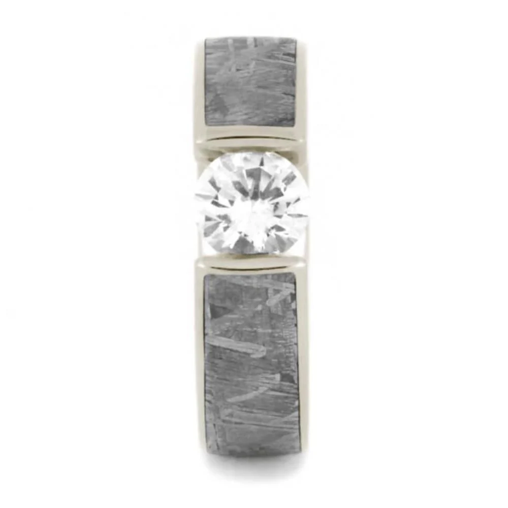Tension Set White Sapphire Ring with Meteorite in White Gold