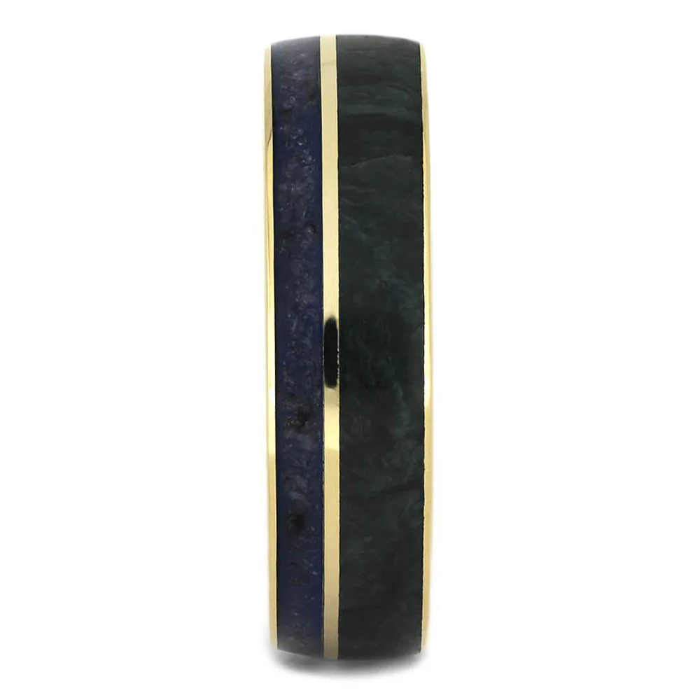 This jade wedding band brings together green and blue inlays in a 14k yellow gold ring. A yellow gold pinstripe divides a solid jade and crushed sapphire. The crushed sapphires are a unique way to bring a blue tone without using a traditional sapphire setting.